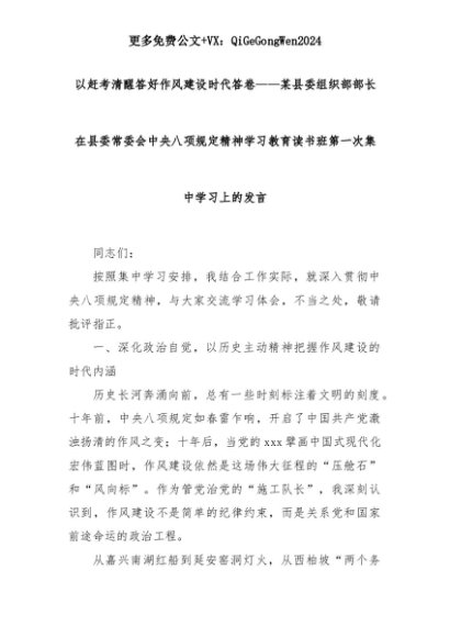 【七哥公文】2025年:以赶考清醒答好作风建设时代答卷——某县委组织部部长在县委常委会中央八项规定精神学习教育读书班第一次集中学习上的发言+更多免费公文+VX:QiGeGongWen2024+更多免费公文+VX:QiGeGongWen2024