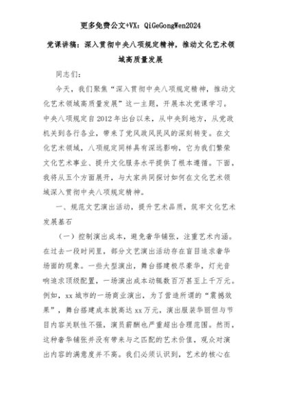 【七哥公文】2025年:党课讲稿:深入贯彻中央八项规定精神,推动文化艺术领域高质量发展+更多免费公文+VX:QiGeGongWen2024+更多免费公文+VX:QiGeGongWen2024
