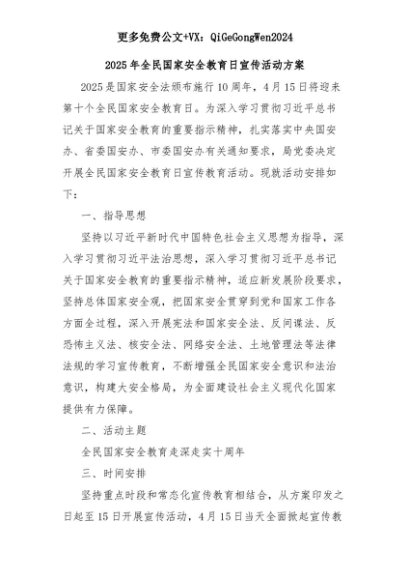 【七哥公文】2025年:2025年全民国家安全教育日宣传活动方案+更多免费公文+VX:QiGeGongWen2024+更多免费公文+VX:QiGeGongWen2024
