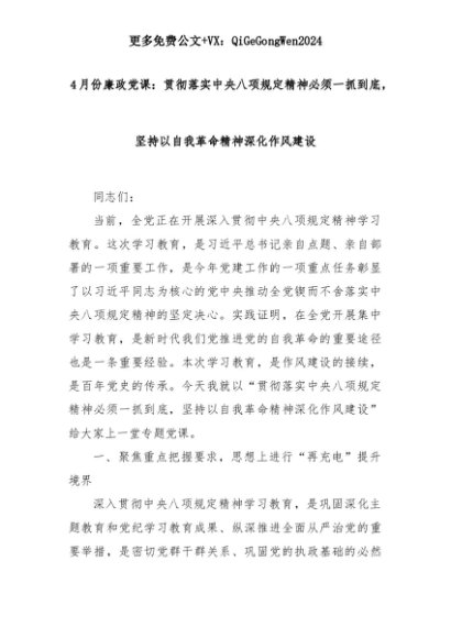 【七哥公文】2025年:4月份廉政党课:贯彻落实中央八项规定精神必须一抓到底,坚持以自我革命精神深化作风建设+更多免费公文+VX:QiGeGongWen2024+更多免费公文+VX:QiGeGongWen2024