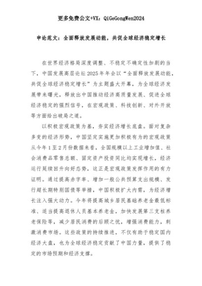 【七哥公文】2025年:申论范文:全面释放发展动能,共促全球经济稳定增长+更多免费公文+VX:QiGeGongWen2024+更多免费公文+VX:QiGeGongWen2024