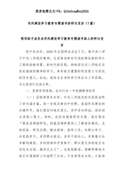 【七哥公文】2025年:(7篇)作风建设学习教育专题读书班研讨发言+更多免费公文+VX:QiGeGongWen2024+更多免费公文+VX:QiGeGongWen2024