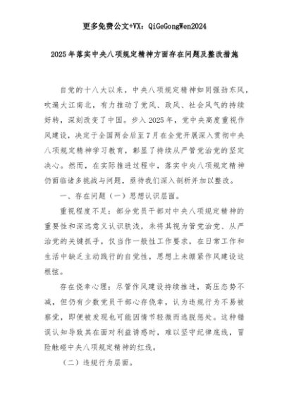 【七哥公文】2025年:2025 年落实中央八项规定精神方面存在问题及整改措施+更多免费公文+VX:QiGeGongWen2024+更多免费公文+VX:QiGeGongWen2024