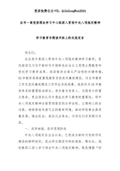 【七哥公文】2025年:在市一高党委理论学习中心组深入贯彻中央八项规定精神学习教育专题读书班上的交流发言+更多免费公文+VX:QiGeGongWen2024+更多免费公文+VX:QiGeGongWen2024