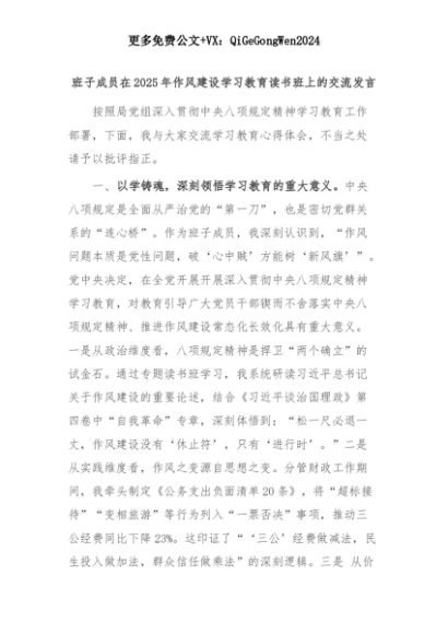 【七哥公文】2025年:班子成员在2025年作风建设学习教育读书班上的交流发言+更多免费公文+VX:QiGeGongWen2024+更多免费公文+VX:QiGeGongWen2024