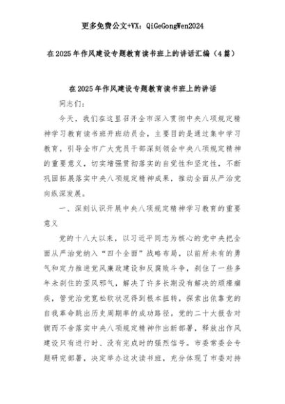 【七哥公文】2025年:(4篇)在2025年作风建设专题教育读书班上的讲话汇编+更多免费公文+VX:QiGeGongWen2024+更多免费公文+VX:QiGeGongWen2024