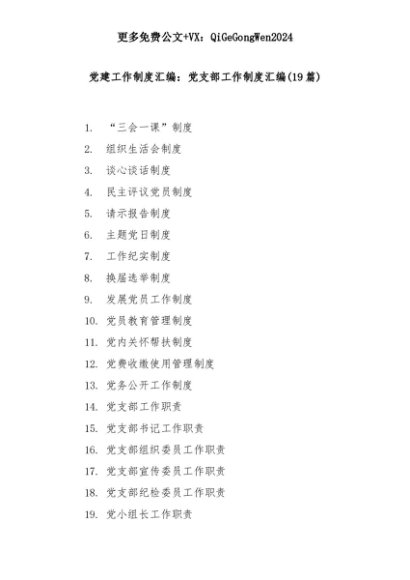 【七哥公文】2025年:(19篇)党建工作制度汇编: 党支部工作制度汇编+更多免费公文+VX:QiGeGongWen2024+更多免费公文+VX:QiGeGongWen2024