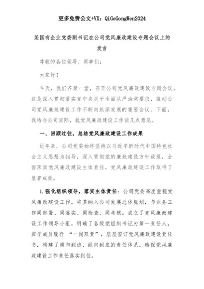 【七哥公文】2025年:某国有企业党委副书记在公司党风廉政建设专题会议上的发言+更多免费公文+VX:QiGeGongWen2024+更多免费公文+VX:QiGeGongWen2024
