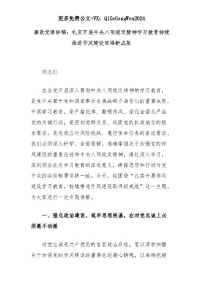 【七哥公文】2025年:廉政党课讲稿:扎实开展中央八项规定精神学习教育持续推进作风建设取得新成效+更多免费公文+VX:QiGeGongWen2024+更多免费公文+VX:QiGeGongWen2024