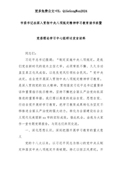 【七哥公文】2025年:市委书记在深入贯彻中央八项规定精神学习教育读书班暨党委理论学习中心组研讨发言材料+更多免费公文+VX:QiGeGongWen2024+更多免费公文+VX:QiGeGongWen2024