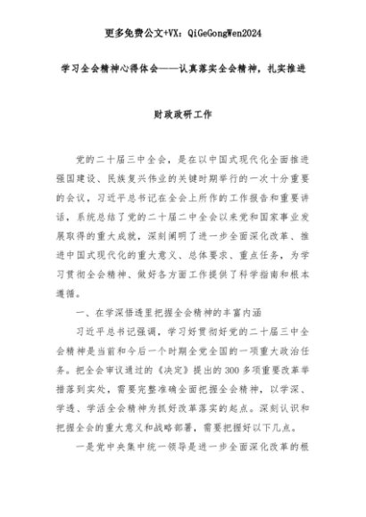 【七哥公文】2025年:学习全会精神心得体会——认真落实全会精神,扎实推进财政政研工作+更多免费公文+VX:QiGeGongWen2024+更多免费公文+VX:QiGeGongWen2024
