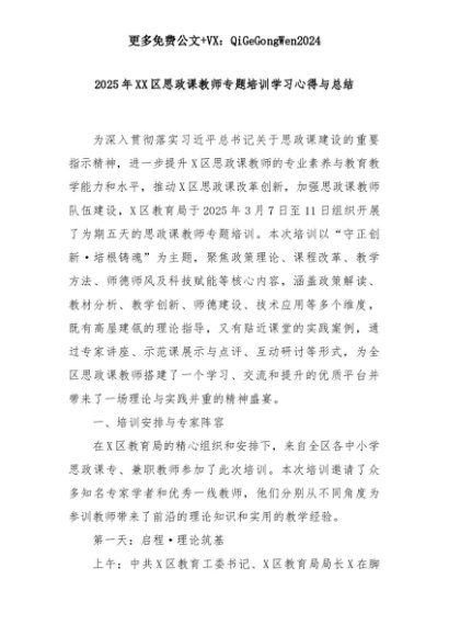 【七哥公文】2025年:2025年XX区思政课教师专题培训学习心得与总结+更多免费公文+VX:QiGeGongWen2024+更多免费公文+VX:QiGeGongWen2024