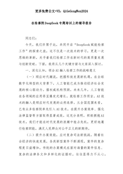 【七哥公文】2025年:在检察院DeepSeek专题培训上的辅导报告+更多免费公文+VX:QiGeGongWen2024+更多免费公文+VX:QiGeGongWen2024