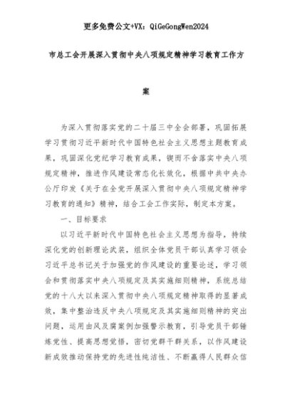 【七哥公文】2025年:市总工会开展深入贯彻中央八项规定精神学习教育工作方案+更多免费公文+VX:QiGeGongWen2024+更多免费公文+VX:QiGeGongWen2024