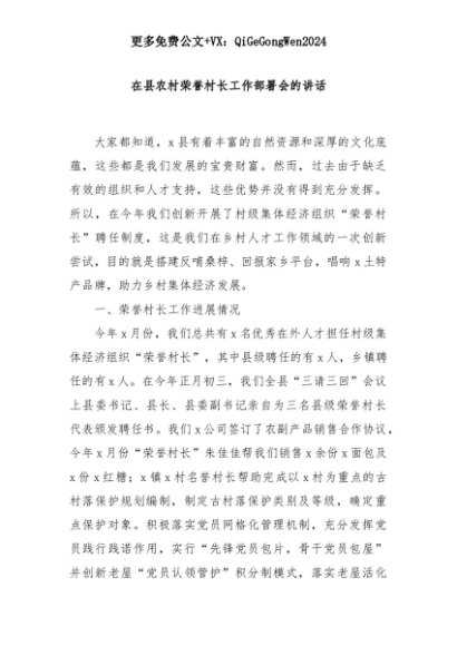 【七哥公文】2025年:在县农村荣誉村长工作部署会的讲话+更多免费公文+VX:QiGeGongWen2024+更多免费公文+VX:QiGeGongWen2024