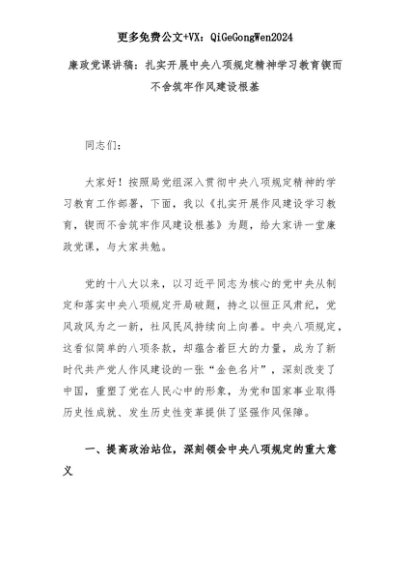 【七哥公文】2025年:廉政党课讲稿:扎实开展中央八项规定精神学习教育锲而不舍筑牢作风建设根基+更多免费公文+VX:QiGeGongWen2024+更多免费公文+VX:QiGeGongWen2024