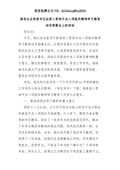 【七哥公文】2025年:国有企业党委书记在深入贯彻中央八项规定精神学习教育动员部署会上的讲话+更多免费公文+VX:QiGeGongWen2024+更多免费公文+VX:QiGeGongWen2024