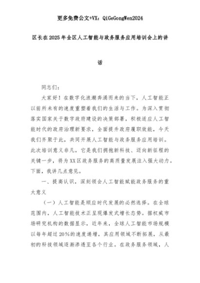 【七哥公文】2025年:区长在2025年全区人工智能与政务服务应用培训会上的讲话+更多免费公文+VX:QiGeGongWen2024+更多免费公文+VX:QiGeGongWen2024