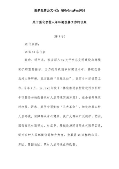 【七哥公文】2025年:关于强化农村人居环境改善工作的议案+更多免费公文+VX:QiGeGongWen2024+更多免费公文+VX:QiGeGongWen2024