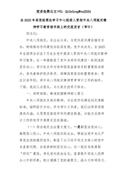 【七哥公文】2025年:在2025年局党组理论学习中心组深入贯彻中央八项规定精神学习教育读书班上的交流发言(审计)+更多免费公文+VX:QiGeGongWen2024+更多免费公文+VX:QiGeGongWen2024