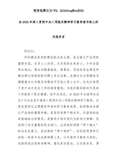 【七哥公文】2025年:在2025年深入贯彻中央八项规定精神学习教育读书班上的交流发言+更多免费公文+VX:QiGeGongWen2024+更多免费公文+VX:QiGeGongWen2024