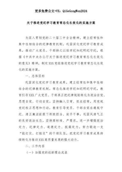 【七哥公文】2025年:关于推进党纪学习教育常态化长效化的实施方案+更多免费公文+VX:QiGeGongWen2024+更多免费公文+VX:QiGeGongWen2024