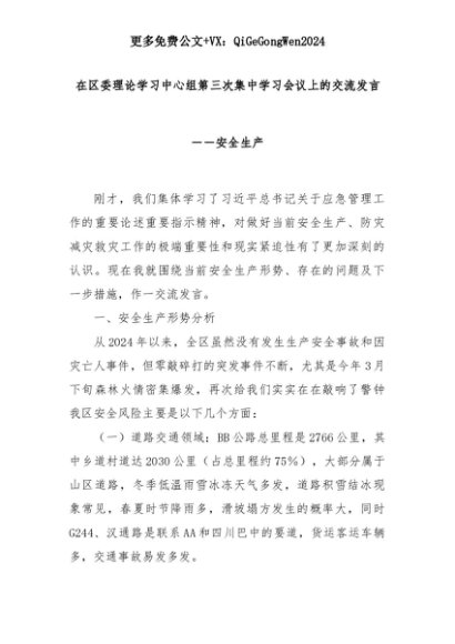 【七哥公文】2025年:在区委理论学习中心组第三次集中学习会议上的交流发言--安全生产+更多免费公文+VX:QiGeGongWen2024+更多免费公文+VX:QiGeGongWen2024
