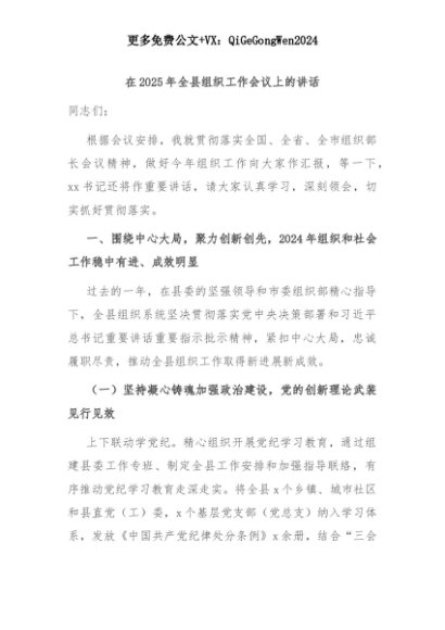 【七哥公文】2025年:在2025年全县组织工作会议上的讲话+更多免费公文+VX:QiGeGongWen2024+更多免费公文+VX:QiGeGongWen2024