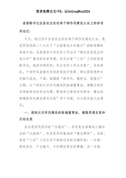 【七哥公文】2025年:县委副书记在县农业农村局干部作风建设大会上的讲话+更多免费公文+VX:QiGeGongWen2024+更多免费公文+VX:QiGeGongWen2024