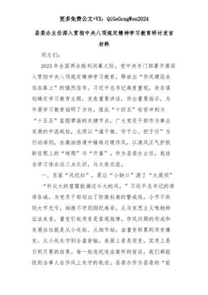 【七哥公文】2025年:县委办主任深入贯彻中央八项规定精神学习教育研讨发言材料+更多免费公文+VX:QiGeGongWen2024+更多免费公文+VX:QiGeGongWen2024
