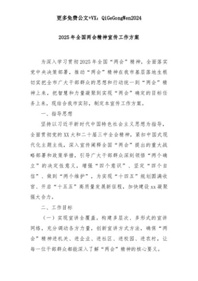 【七哥公文】2025年:2025年全国两会精神宣传工作方案+更多免费公文+VX:QiGeGongWen2024+更多免费公文+VX:QiGeGongWen2024
