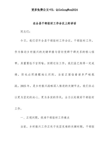 【七哥公文】2025年:2025年在全县干部驻村工作会议上的讲话(1)+更多免费公文+VX:QiGeGongWen2024+更多免费公文+VX:QiGeGongWen2024