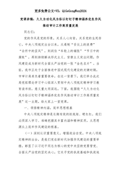 【七哥公文】2025年:党课讲稿:久久为功化风为俗以钉钉子精神涵养优良作风推动审计工作高质量发展+更多免费公文+VX:QiGeGongWen2024+更多免费公文+VX:QiGeGongWen2024