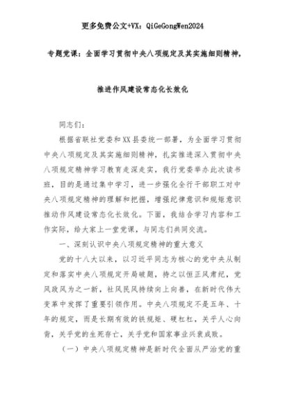 【七哥公文】2025年:专题党课:全面学习贯彻中央八项规定及其实施细则精神,推进作风建设常态化长效化+更多免费公文+VX:QiGeGongWen2024+更多免费公文+VX:QiGeGongWen2024