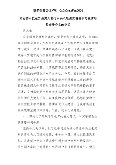 【七哥公文】2025年:党支部书记在开展深入贯彻中央八项规定精神学习教育动员部署会上的讲话+更多免费公文+VX:QiGeGongWen2024+更多免费公文+VX:QiGeGongWen2024