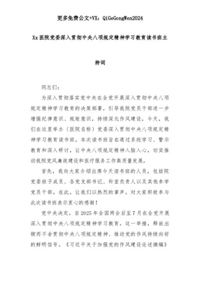 【七哥公文】2025年:Xx医院党委深入贯彻中央八项规定精神学习教育读书班主持词+更多免费公文+VX:QiGeGongWen2024+更多免费公文+VX:QiGeGongWen2024
