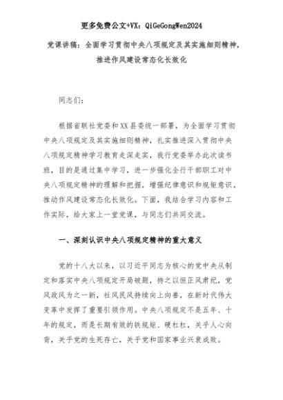 【七哥公文】2025年:党课讲稿:全面学习贯彻中央八项规定及其实施细则精神,推进作风建设常态化长效化+更多免费公文+VX:QiGeGongWen2024+更多免费公文+VX:QiGeGongWen2024