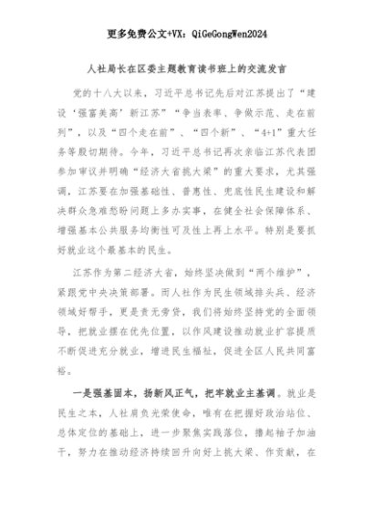 【七哥公文】2025年:人社局长在区委主题教育读书班上的交流发言+更多免费公文+VX:QiGeGongWen2024+更多免费公文+VX:QiGeGongWen2024