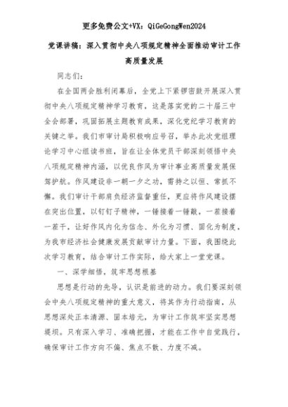 【七哥公文】2025年:党课讲稿:深入贯彻中央八项规定精神全面推动审计工作高质量发展+更多免费公文+VX:QiGeGongWen2024+更多免费公文+VX:QiGeGongWen2024