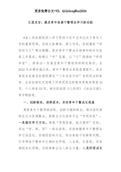 【七哥公文】2025年:汇报发言:激发青年检察干警理论学习新动能+更多免费公文+VX:QiGeGongWen2024+更多免费公文+VX:QiGeGongWen2024