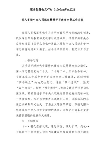 【七哥公文】2025年:深入贯彻中央八项规定精神学习教育专题工作方案+更多免费公文+VX:QiGeGongWen2024+更多免费公文+VX:QiGeGongWen2024
