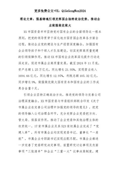 【七哥公文】2025年:理论文章:强基铸魂引领发挥国企独特政治优势,推动企业做强做优做大+更多免费公文+VX:QiGeGongWen2024+更多免费公文+VX:QiGeGongWen2024