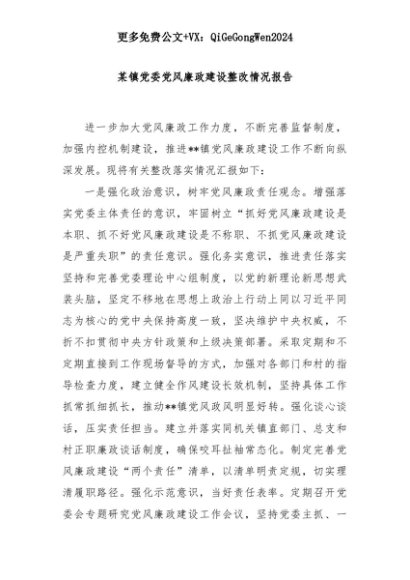 【七哥公文】2025年:某镇党委党风廉政建设整改情况报告+更多免费公文+VX:QiGeGongWen2024+更多免费公文+VX:QiGeGongWen2024