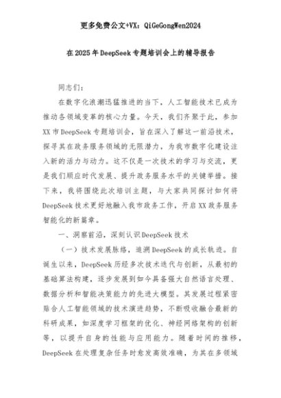 【七哥公文】2025年:在2025年DeepSeek专题培训会上的辅导报告+更多免费公文+VX:QiGeGongWen2024+更多免费公文+VX:QiGeGongWen2024
