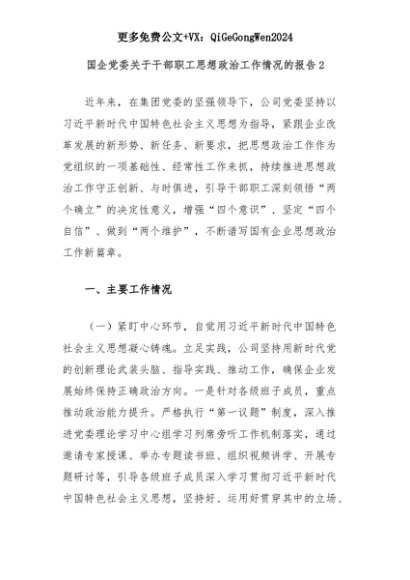 【七哥公文】2025年:国企党委关于干部职工思想政治工作情况的报告2+更多免费公文+VX:QiGeGongWen2024+更多免费公文+VX:QiGeGongWen2024