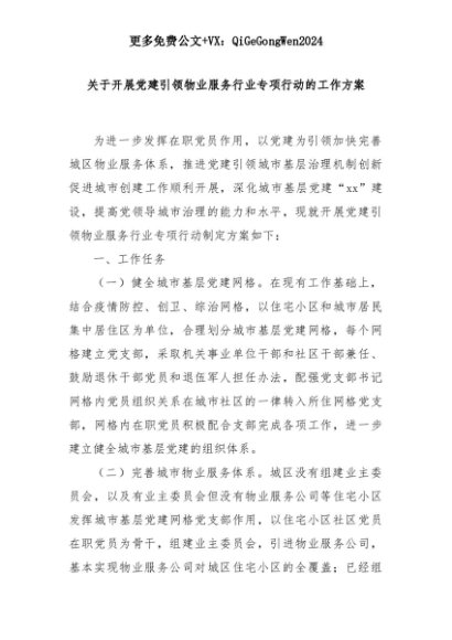 【七哥公文】2025年:关于开展党建引领物业服务行业专项行动的工作方案+更多免费公文+VX:QiGeGongWen2024+更多免费公文+VX:QiGeGongWen2024