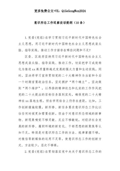 【七哥公文】2025年:意识形态工作巡察谈话提纲(10条)+更多免费公文+VX:QiGeGongWen2024+更多免费公文+VX:QiGeGongWen2024