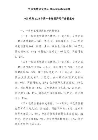 【七哥公文】2025年:市财政局2025年第一季度经济运行分析报告+更多免费公文+VX:QiGeGongWen2024+更多免费公文+VX:QiGeGongWen2024