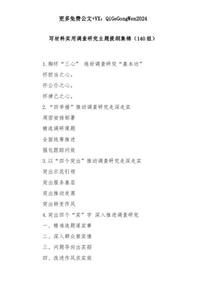 【七哥公文】2025年:写材料实用调查研究主题提纲集锦(140组)+更多免费公文+VX:QiGeGongWen2024+更多免费公文+VX:QiGeGongWen2024