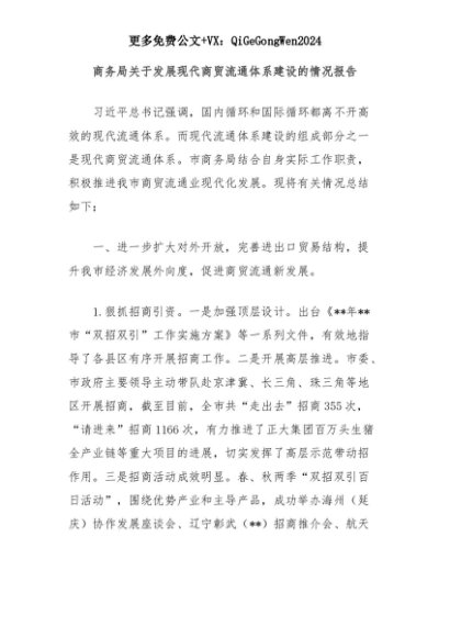 【七哥公文】2025年:商务局关于发展现代商贸流通体系建设的情况报告+更多免费公文+VX:QiGeGongWen2024+更多免费公文+VX:QiGeGongWen2024